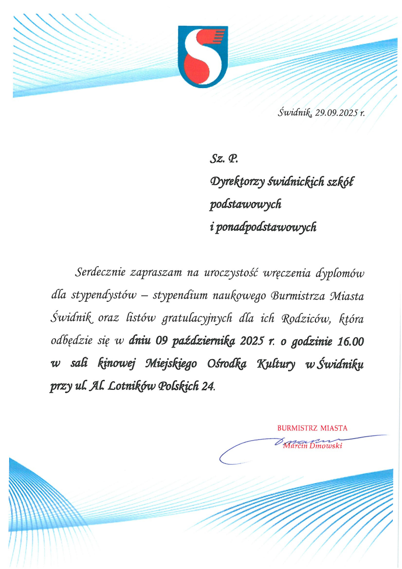 Uroczyste wręczenie dyplomów najlepszym Uczniom naszej Gminy oraz listów gratulacyjnych ich Rodzicom, odbędzie się podczas XVII Gali Stypendialnej w dniu 09 października 2025 r. o godz. 16:00 w Sali kinowej Miejskiego Ośrodka Kultury w Świdniku, przy ul. Al. Lotników Polskich 24., na którą Burmistrz Miasta Świdnik serdecznie zaprasza Stypendystów wraz z Rodzicami.